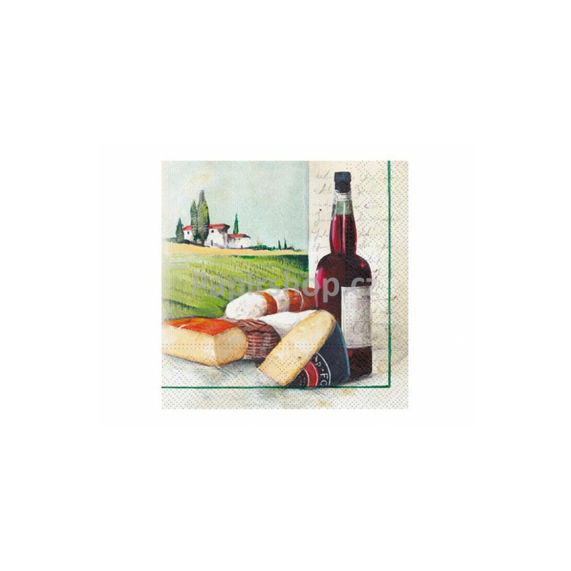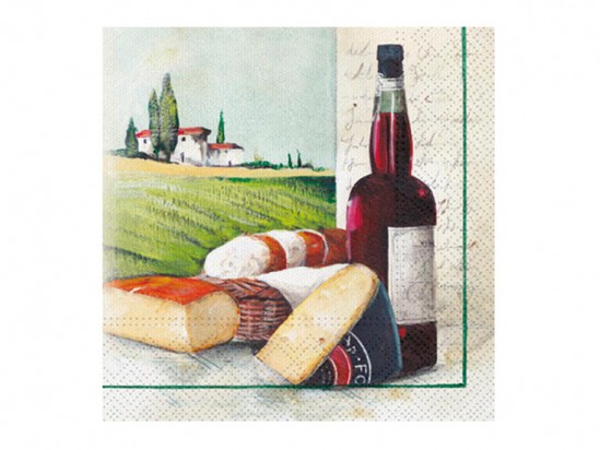 Ubrousek, který vás přenese přímo do srdce Toskánska. Malebná krajina s cypřiši, láhev červeného vína, sýry a čerstvé pečivo vytváří atmosféru pohodových chvil strávených s přáteli u dobrého jídla. Skvěle se hodí nejen na letní posezení na terase, ale i na slavnostní večeře či pikniky.