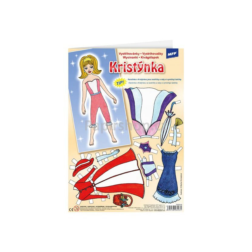 Vystřihovánky s Kristýnku, vhodné pro mladé slečny. Obleč si Kristýnku podle svého vlastního vkusu. Vystřihovánky jsou na 2 listech formátu A4. Najdeš zde princeznu, spoustu různých šatů, vlasů a doplňků. Vystřihovánky rozvíjejí kreativitu dětí pomocí různých tvarů, barev a také zlepšují motoriku ruky.